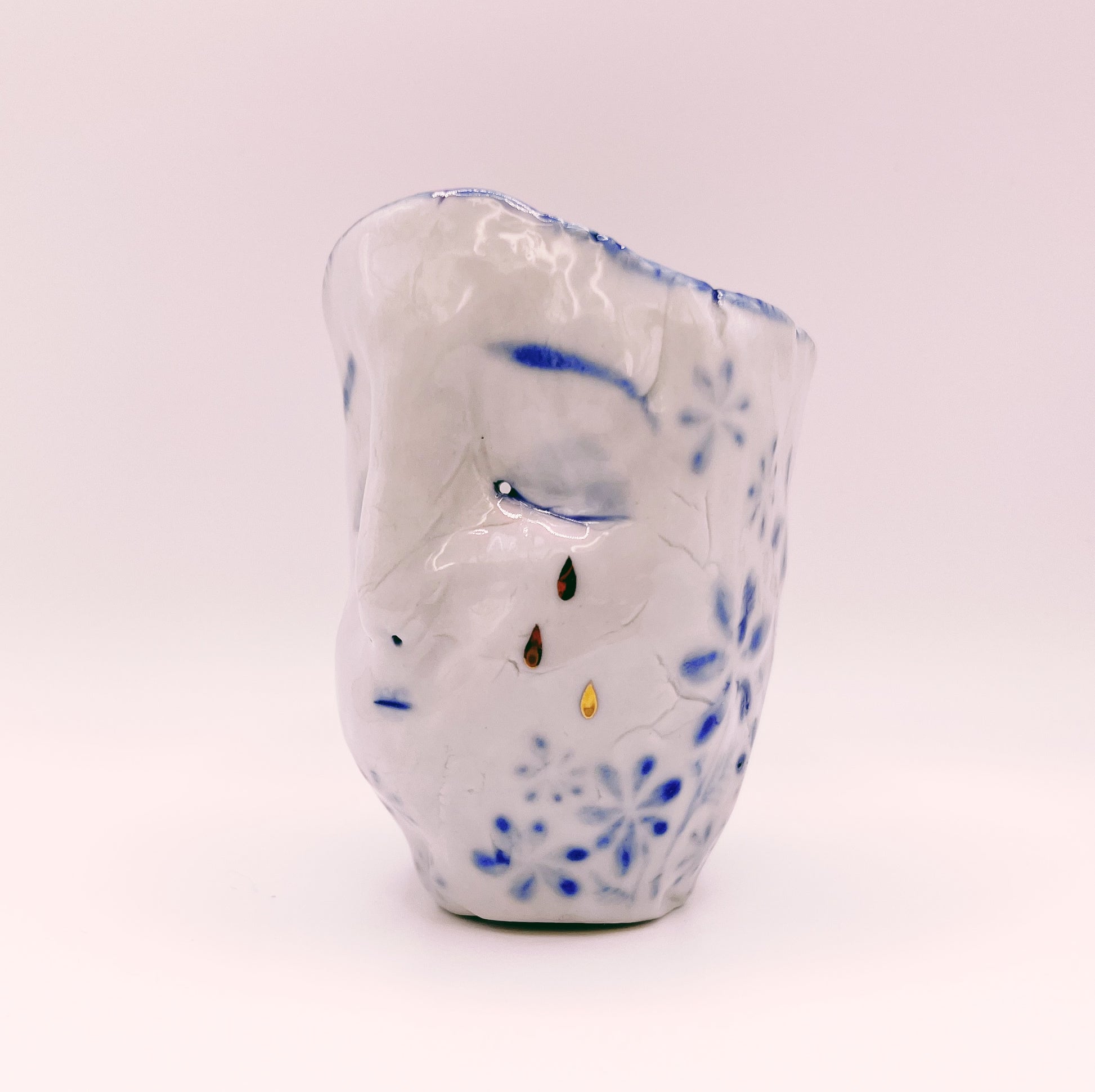 Blue and white porcelain cup that cries if you fill it. 18k gold accents. 4”x2”