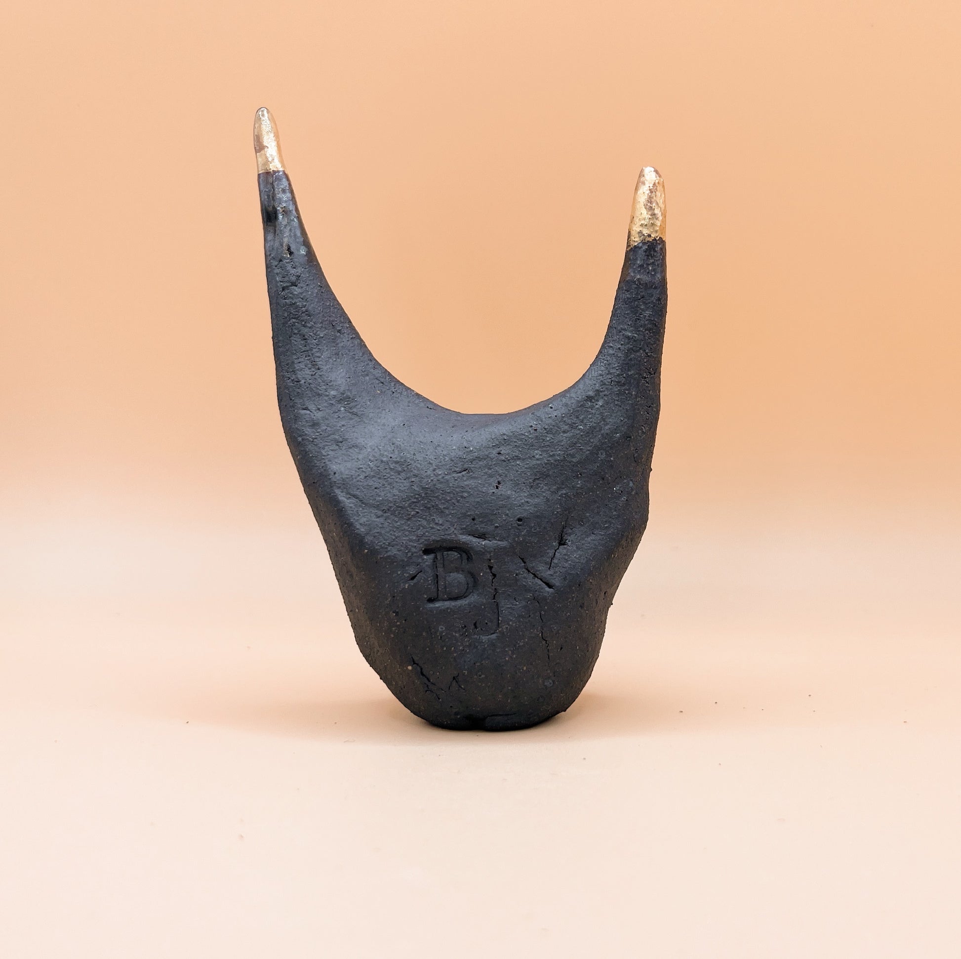 Halloween cat with 18k gold accents and black glitter, sculpted from iron rich black mountain clay. 3”